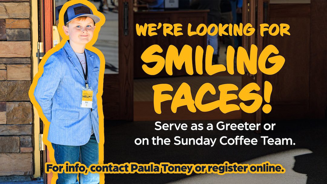 Love to serve through hospitality? Opportunities are available to serve as Greeters and on the Sunday Morning Refreshment Team. Contact Paula Toney.