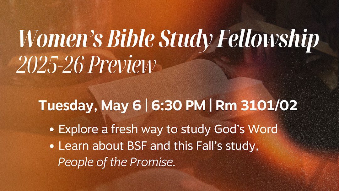 May 6 | 6:30 PM | Room 3101/02 | Ladies, come discover what BSF (Bible Study Fellowship) is all about! If you’re looking for a fresh, engaging way to study God’s Word, join us this Tuesday for a special evening. We’ll reflect on how this year’s study has made an impact and share an exciting preview of what’s coming for the 2025–26 season. Whether you’re curious, new, or considering joining us in the fall, this event is a perfect opportunity to see what BSF is like, ask questions, and connect with others. Light refreshments will be served—we’d love to see you there!